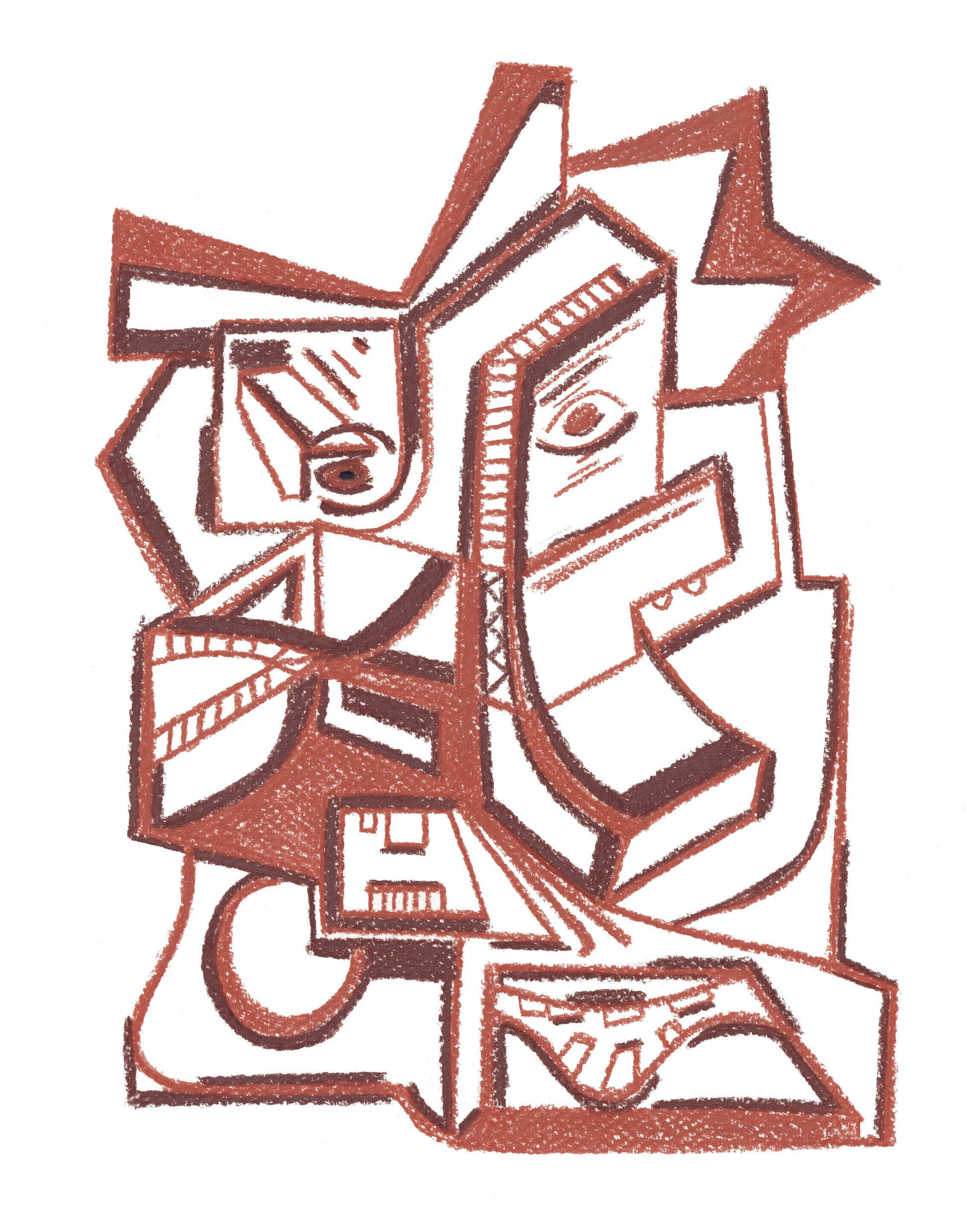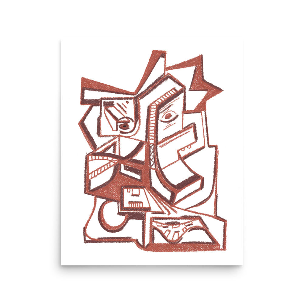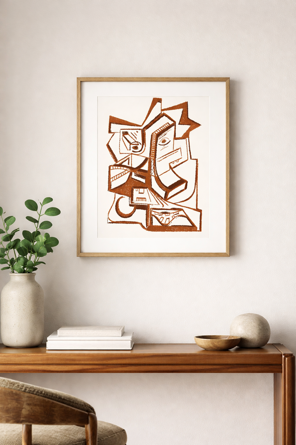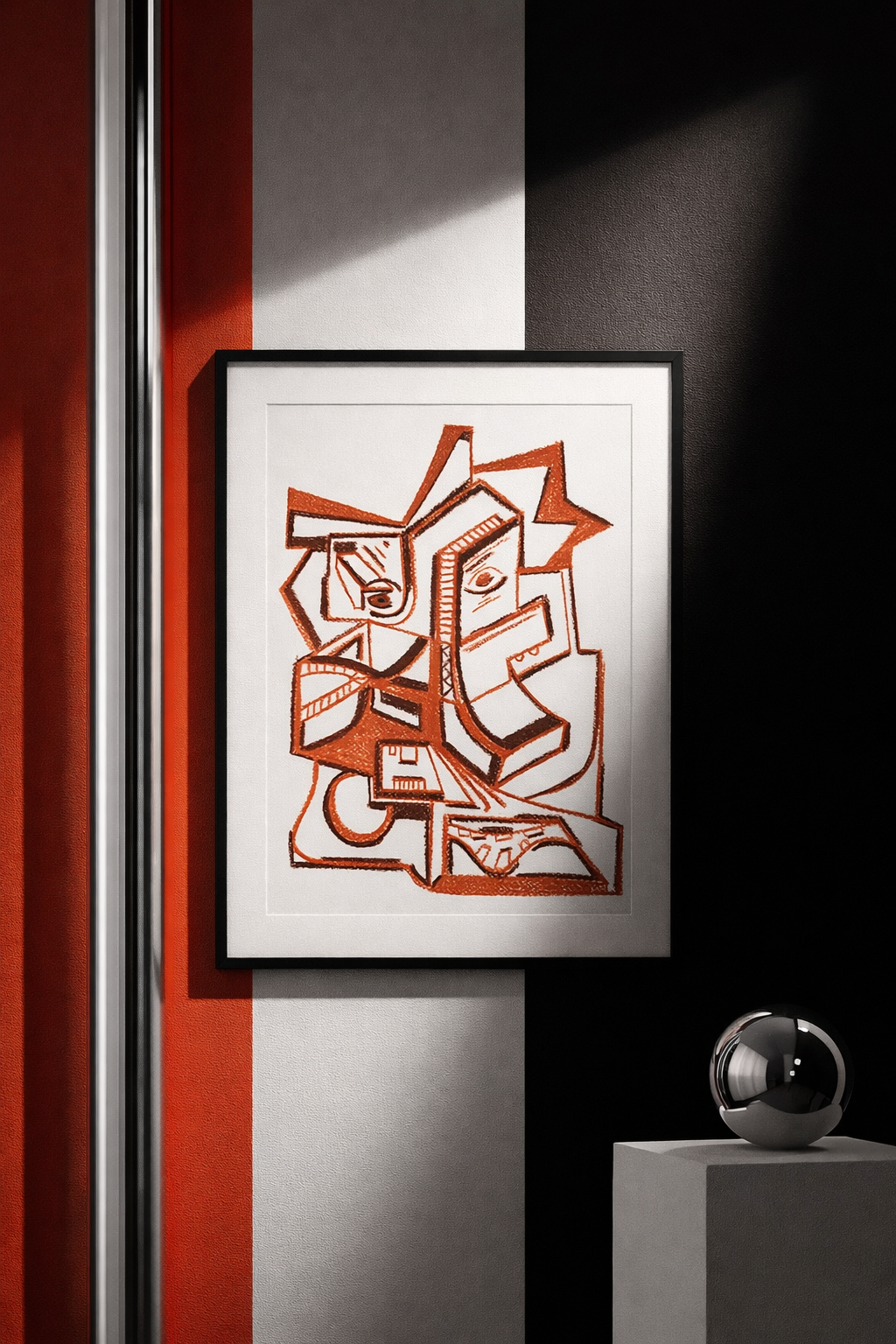 Double Gaze begins as a simple head, then fractures into stacked planes, part face, part diagram. A central spine splits the portrait, holding one eye forward while another eye slips sideways inside a tilted frame, as if the self is looking in two directions at once. Rust-colored lines and quick hatch marks build depth like a plan drawing: edges, seams, shadows, each compartment carrying a different expression.
