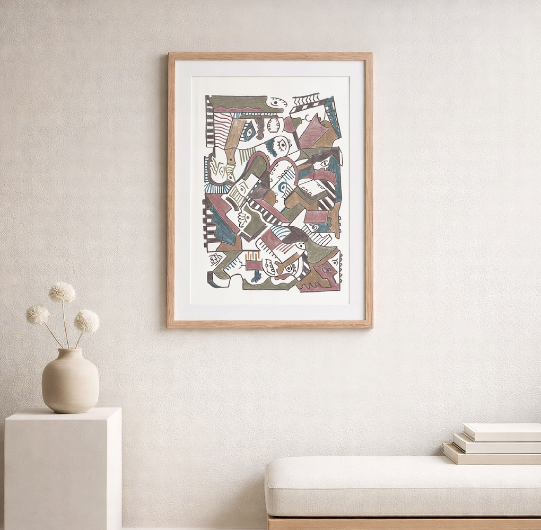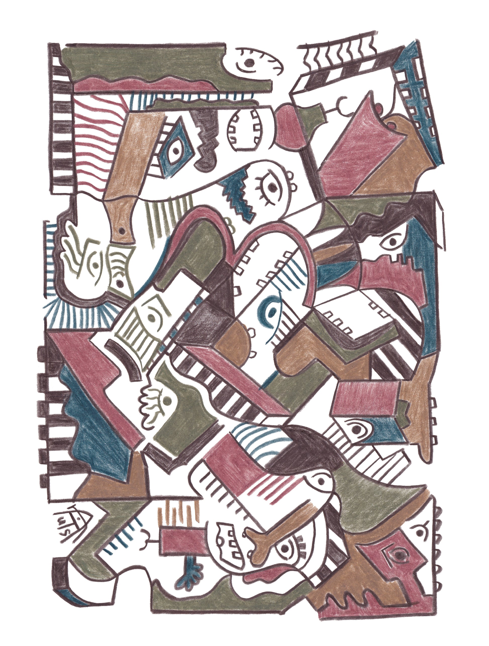 Two creatures appear like trapped impulses, pushing against the stripes of a mapped life. They want to rupture the route, but the grid is everywhere, outside and inside, until even the brain moves along it automatically. The drawing becomes a portrait of resistance under conditioning: a self trying to break free from a path it has learned to follow. The closest thing to an exit is a glitch, a small misalignment where the pattern fails and something real slips through.