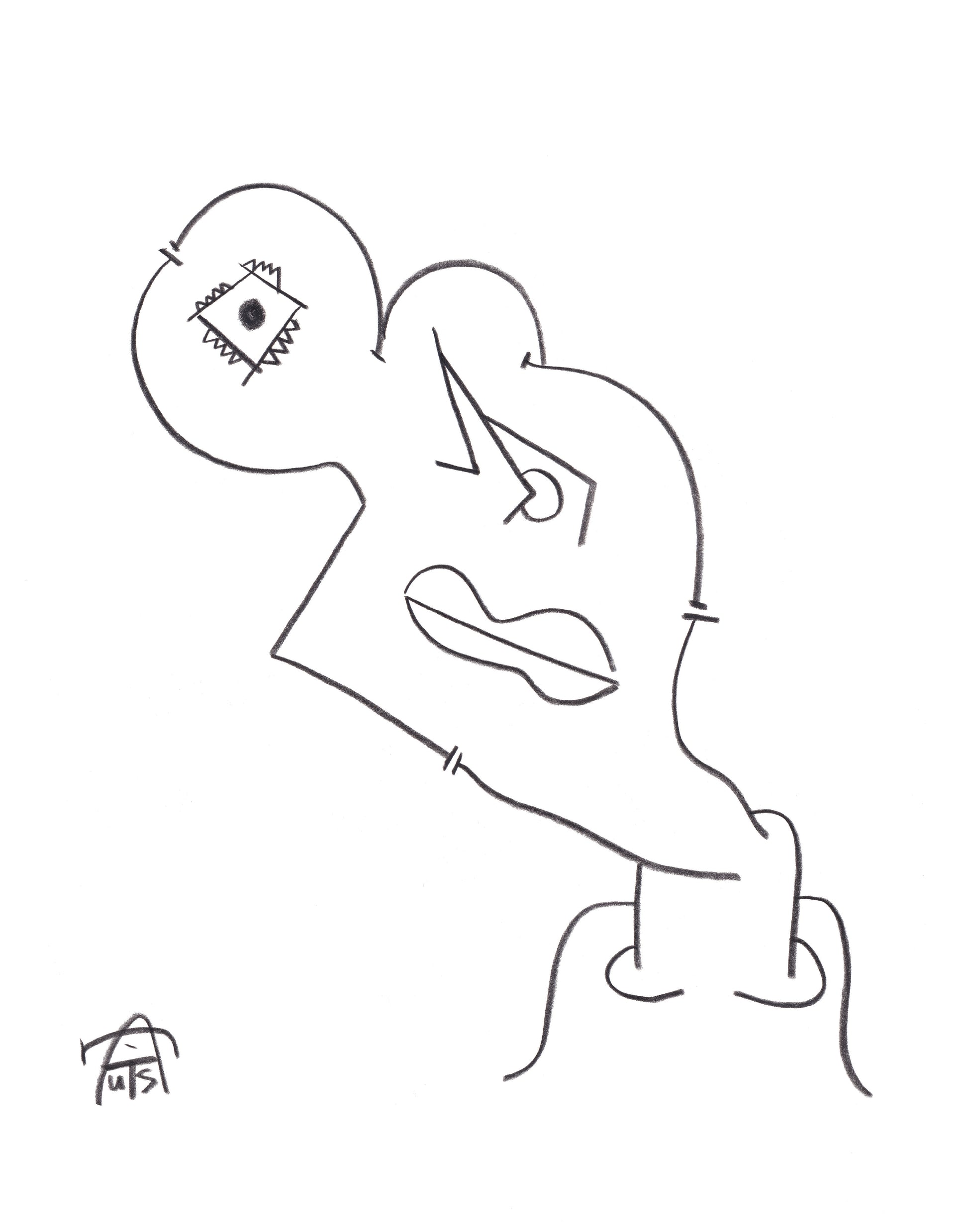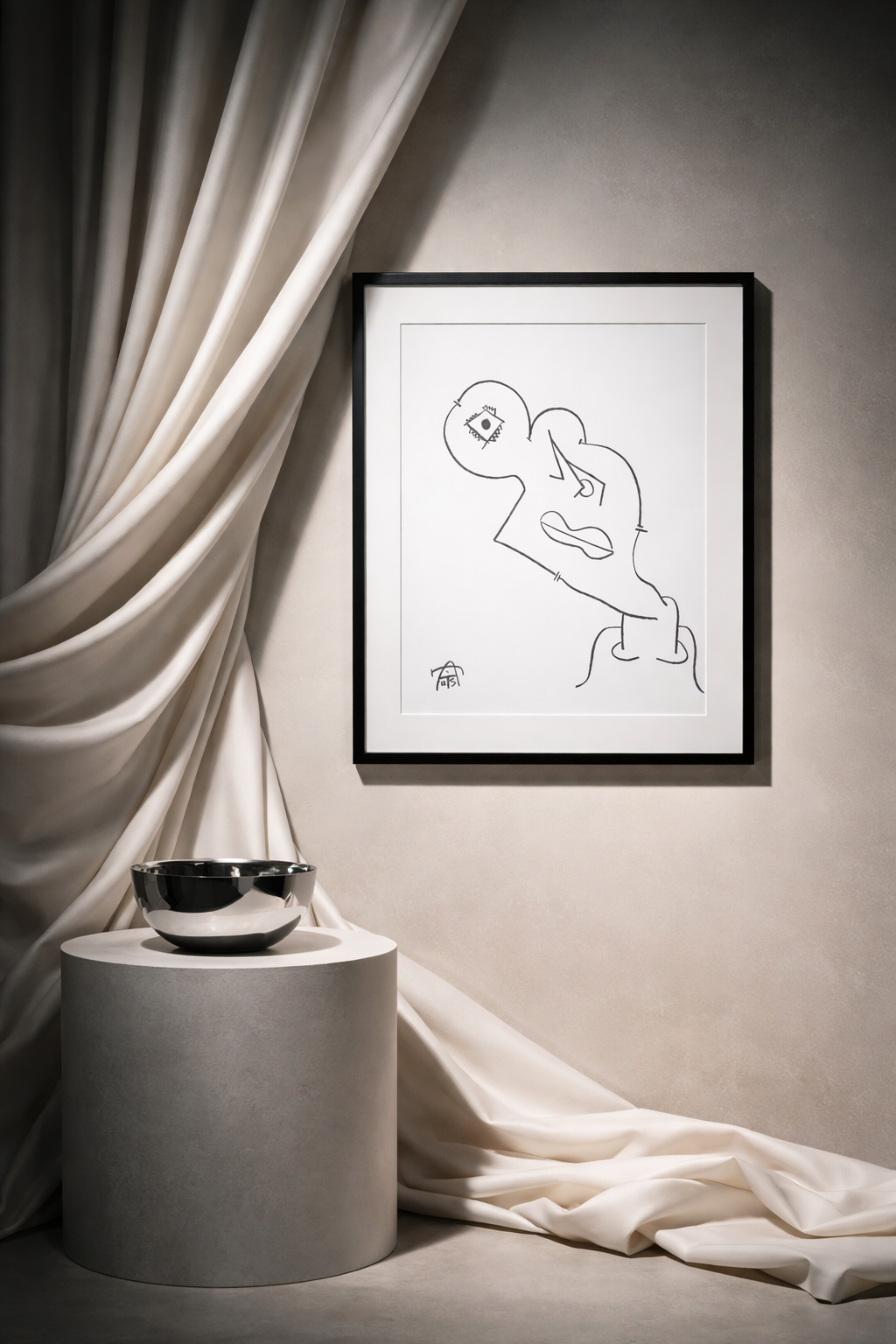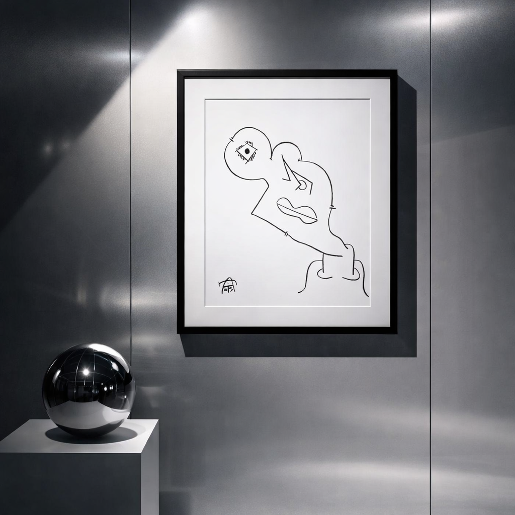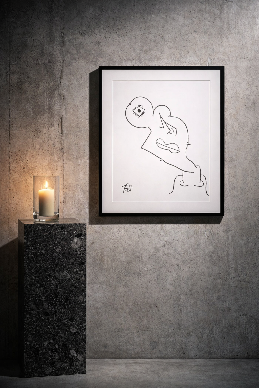 Pinned Eye (2026) reduces the face to a few spare lines, but the expression carries the weight of lived pressure. The slanted profile, sharpened features, and suspended gaze suggest a person shaped by the repeated demands of daily life, fatigue, vigilance, routine, and the quiet labor of holding oneself together. The eye, boxed in and fixed, feels less descriptive than symbolic: a sign of attention under strain, watchful because it has to be. Small stitch-like marks along the outline make the figure appear lightly fastened, as if identity here is not stable but constantly maintained. The result is both fragile and exact, a portrait of how ordinary pressures leave their mark on the face.